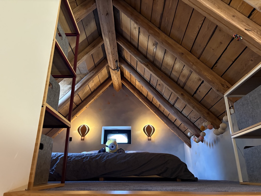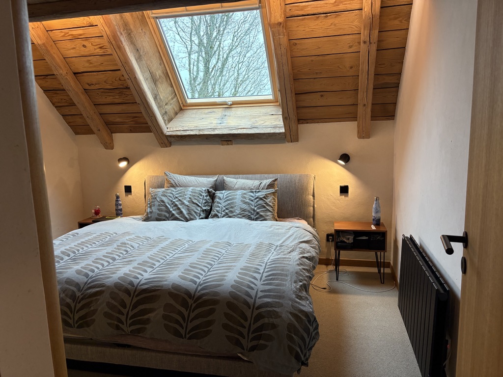 À l’étage, l’atmosphère devient résolument cocooning avec un salon intimiste, deux chambres sublimées par des poutres apparentes sablées, une lingerie et une salle de bain offrant une vue imprenable sur la montagne, invitant à la détente et à la contemplation.