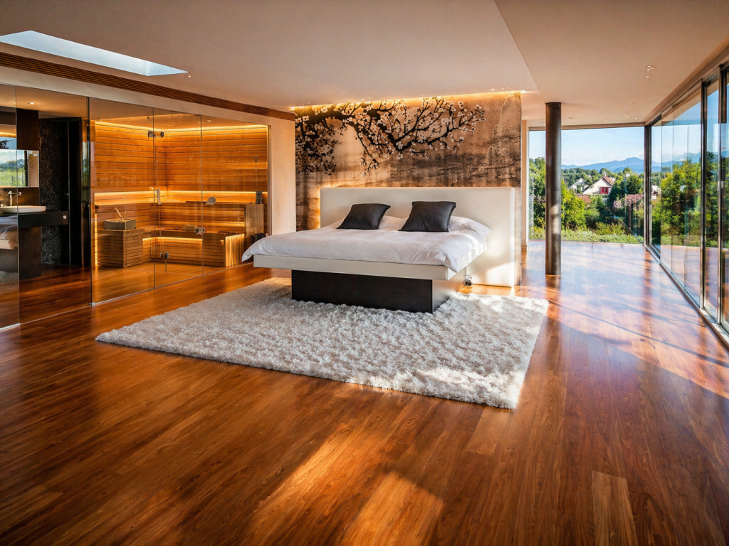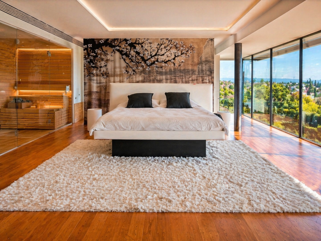 Une superbe chambre avec vue imprenable et sa salle de bain équipée d’un hammam et d’un spa. Un véritable espace de détente digne des plus beaux établissements avec un espace sport, un dressing, une chambre et une lingerie